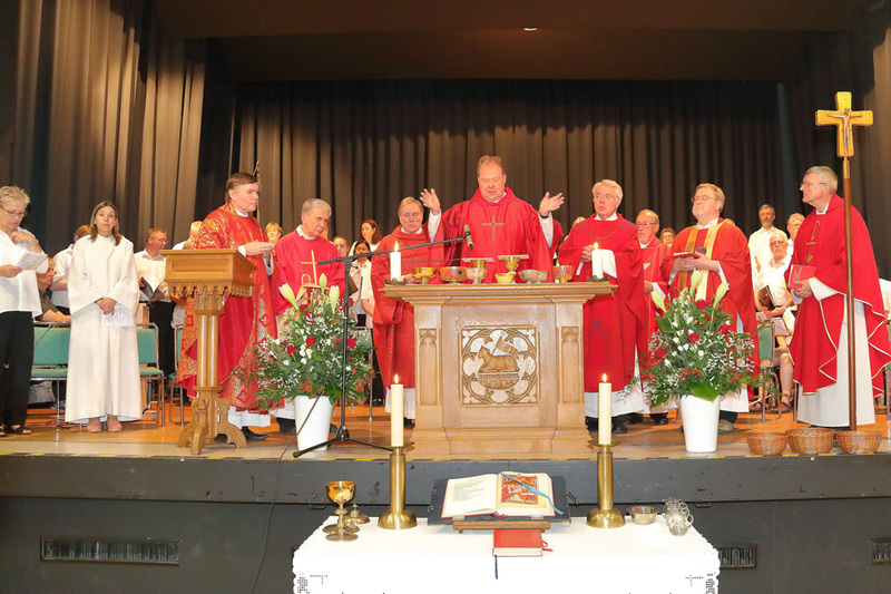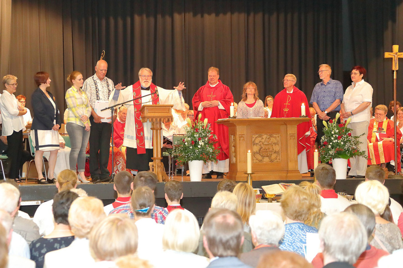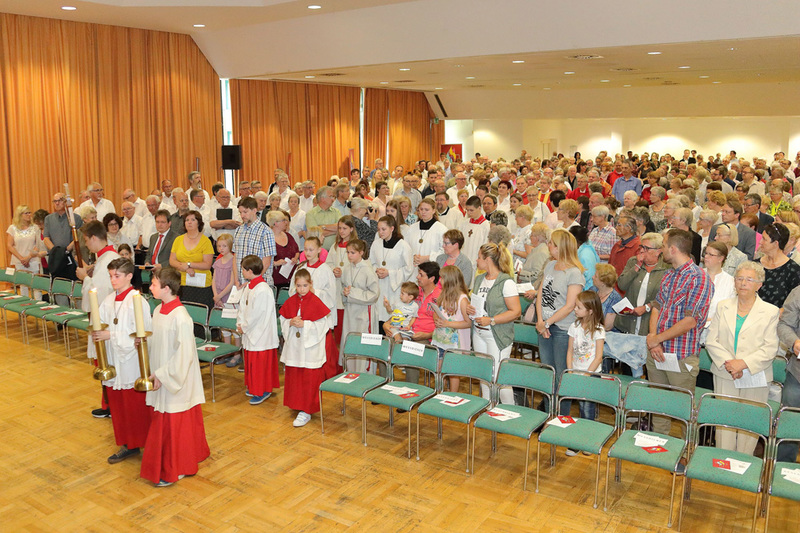 Am Pfingstsonntag 2017 trafen sich die neun katholischen Gemeinden um 10:30 Uhr im Volkshaus Röhlinghausen zur Heiligen Messe und zur anschließenden Begegnung; in den Kirchen fielen am Pfingstsonntagmorgen alle Gottesdienste aus. Ca. 350 Besucher waren ins Volkshaus gekommen. |