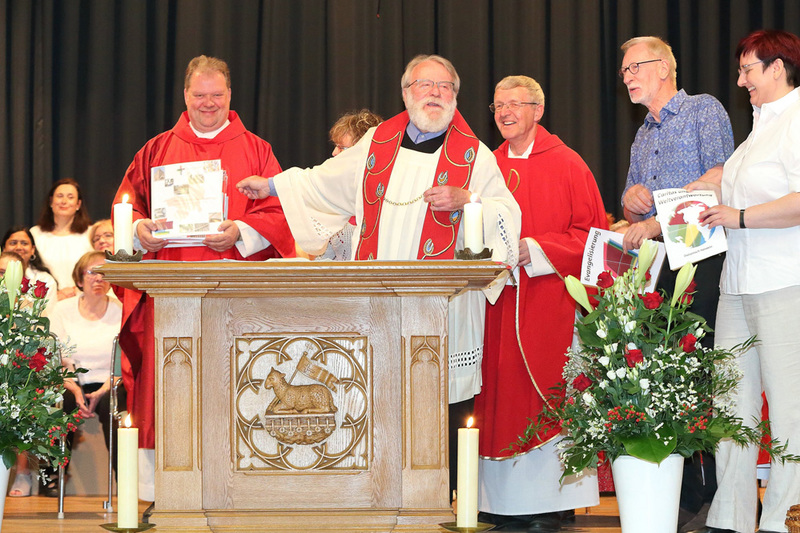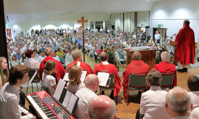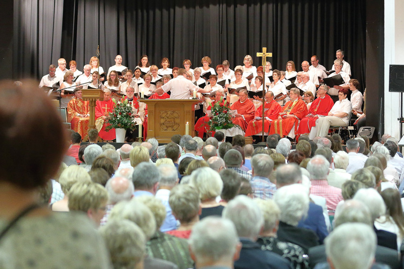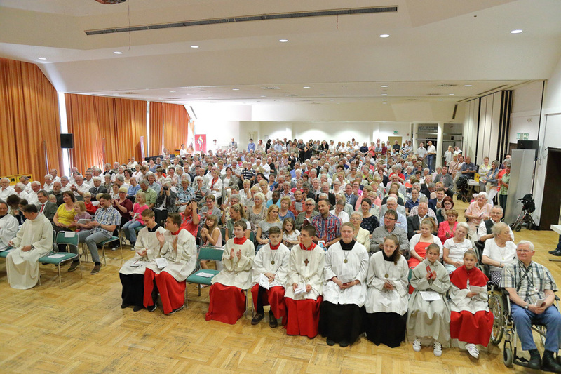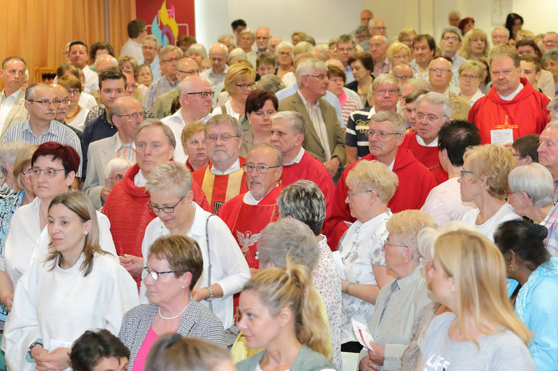 Am Pfingstsonntag 2017 trafen sich die neun katholischen Gemeinden um 10:30 Uhr im Volkshaus Röhlinghausen zur Heiligen Messe und zur anschließenden Begegnung; in den Kirchen fielen am Pfingstsonntagmorgen alle Gottesdienste aus. Ca. 350 Besucher waren ins Volkshaus gekommen. |